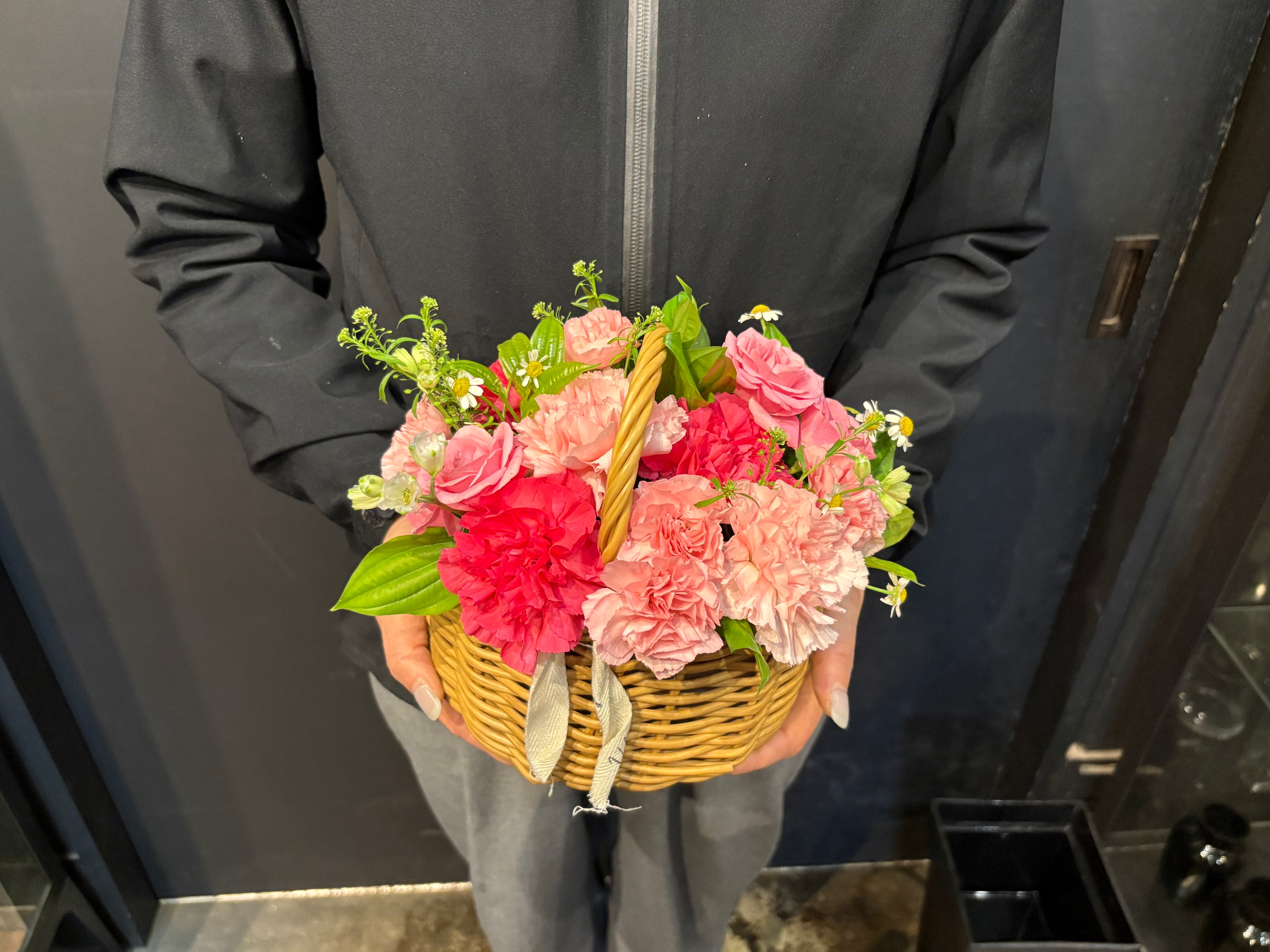 花材:カーネーション、SPバラ、を中心にお作りさせていただきます。その他の花材はその日の仕入れに応じて変わりますので、どうぞご了承ください。